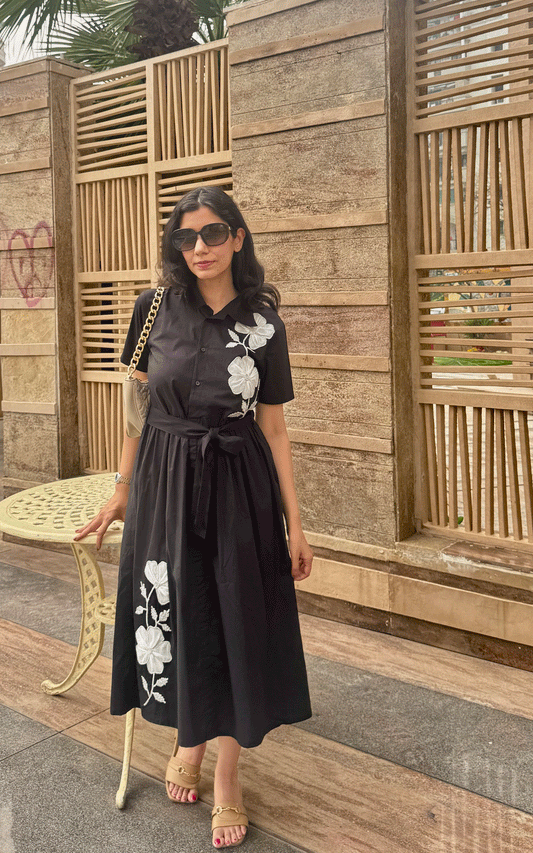 Black floral applique cotton shi...