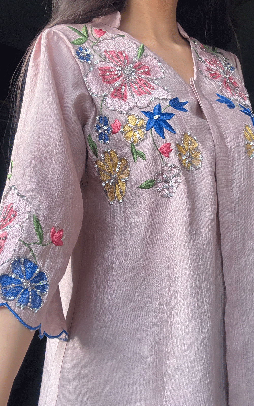 Work: Hand-embroidered floral motifs with minimal and sequin detailin